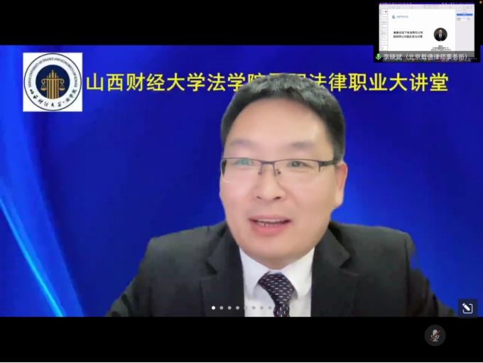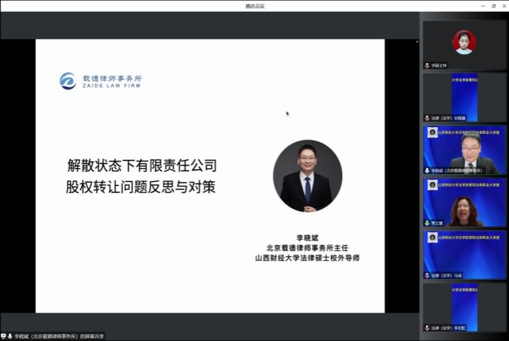 10月28日晚七点,香港三级片 如期在线上举办的“晋阳法律职业大讲堂”第七讲。本期讲座的主题是“解散状态下有限责任公司股权转让问题反思与对策”,由北京载德律师事务所主任李晓斌主讲,香港三级片 樊云慧院长主持,香港三级片 100余名师生参与了本次讲座。