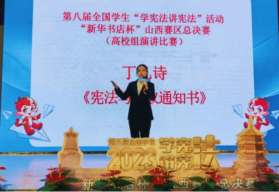 在“学宪法 讲宪法”主题演讲比赛中,丁凡诗同学将自己对宪法的理解融入演讲,通过慷慨激昂的言语阐述学习宪法的心得和感悟,呼吁大家了解宪法、自觉弘扬宪法精神,提升法治素养,赢得了现场评委老师的阵阵掌声。丁凡诗同学赛后说道:“在今后的日子里,我会倍加珍惜这份来之不易的机会,更加努力学习,追求卓越。我衷心感激学校一如既往地关心和支持我们,为我们提供的学习环境和成长平台。”