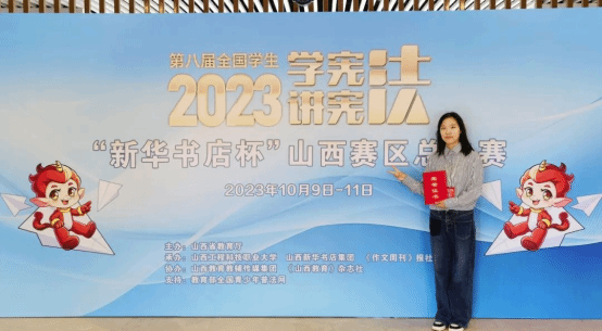 在“学宪法 讲宪法”素养竞赛中,白筱烨同学冷静思考,迅速作答,以昂扬的斗志展现出了扎实的宪法知识基础和良好的心理素质,促进我校尊法学法守法用法的良好学风建设。白筱烨同学赛后说道:“本次比赛我能获得优秀奖,我要感谢学校对我的信任和支持,感谢学院对学风建设的重视,感谢陈思静老师这一路上对我的关怀和鼓励。”