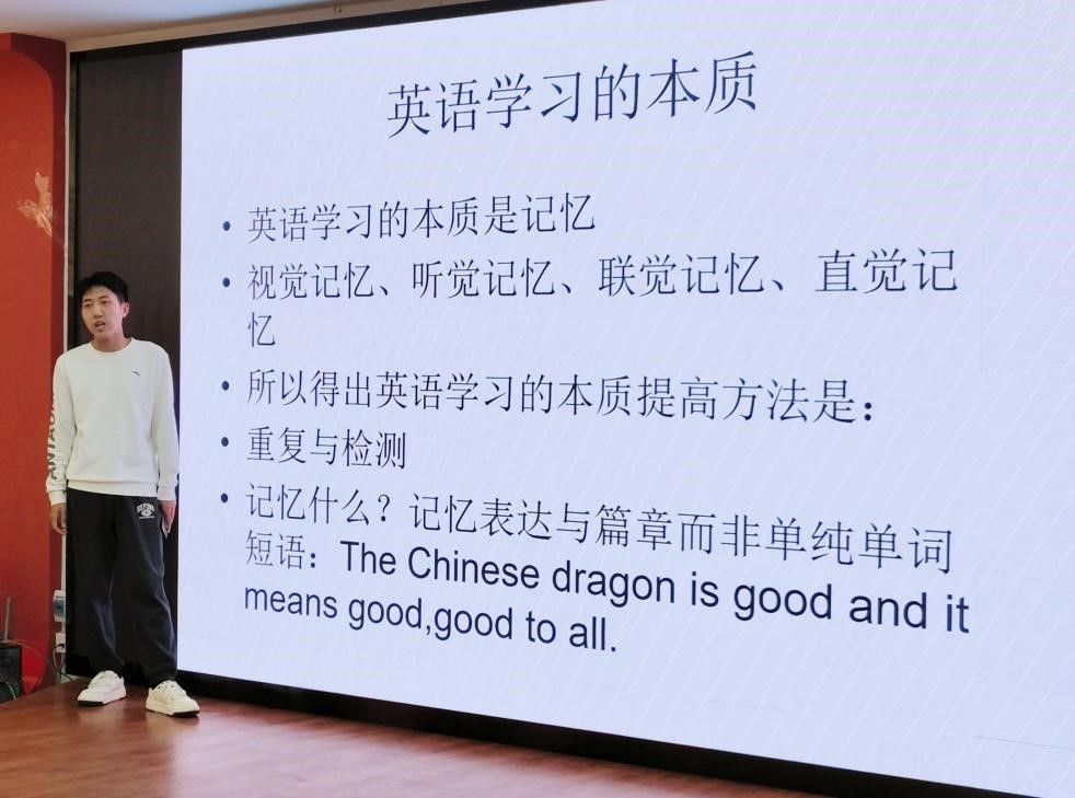 活动伊始,2022级法学三班安小君以“英语学习的本质与实践”为主题展开分享。他提出“记忆-重复-检测”三位一体的学习方法,强调单词积累需与篇章语境深度融合,避免孤立记忆的碎片化弊端。通过现场演示精听与泛听结合的训练模式,展示了如何通过反复打磨听力细节提升辨音能力;在阅读环节,他重点剖析了批判性阅读的核心技巧,建议学生通过逻辑梳理与主旨归纳强化理解深度。此外,他提倡以“真题模拟+错题分析”为备考主线,结合“外研社杯”等赛事拓展综合能力,为在场学生提供了兼具系统性与实操性的学习路径。