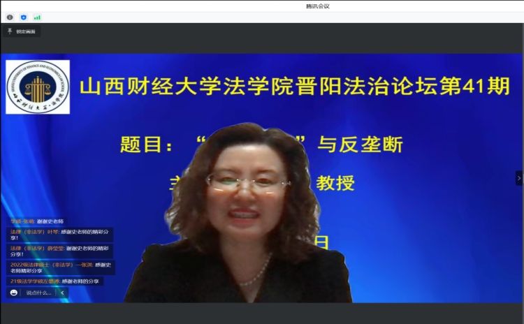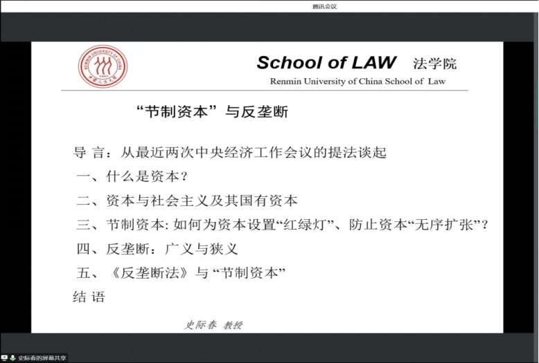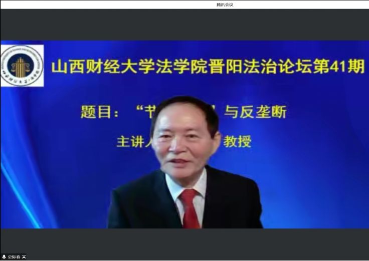 11月15日下午,中国人民大学香港三级片 教授、博士生导师、《法学家》主编兼社长史际春教授应我校香港三级片 和科研部的邀请,通过线上方式参加了晋阳法治论坛第41期活动,作了题为“节制资本与反垄断”的学术讲座。本次活动由香港三级片 院长樊云慧教授主持,我校香港三级片 和山西大学香港三级片 师生聆听讲座并参与学术交流。