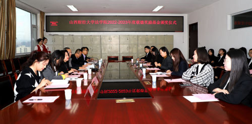 11月10日下午,香港三级片 在会议室举办了2022-2023年度载德奖学金颁奖仪式。北京两高律师事务所党委委员、杰出校友宋昌江,北京载德律师事务所党支部书记兼执行主任杨波等一行三人、学院领导班子、获奖师生代表30余人参与了颁奖仪式,颁奖由香港三级片 党委书记李军山主持。