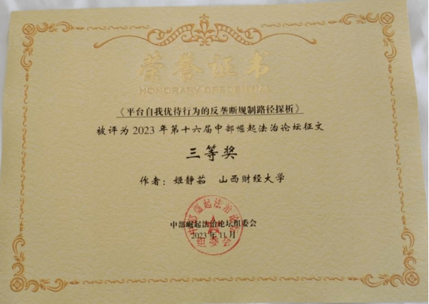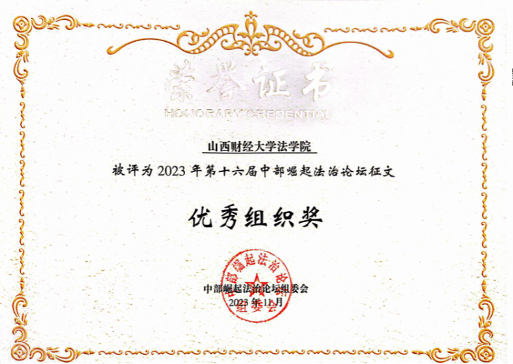 在论坛的征文活动中,学院2022级法学硕士齐康与其导师郗伟明教授合作撰写的论文《论新业态领域风险防控的法治路径》荣获一等奖,2022级法学硕士李竹可、樊增辉合作完成的论文《诉源治理视域下住宅车位(库)确权纠纷检视:困境根源、学理再叙和路径重塑》和2022级法学硕士郝彤彤的论文《新时代推进农村治理法治化的路径探析》荣获二等奖,2022级法律(非法学)硕士姬静茹的论文《平台自我优待行为的反垄断规制路径探析》荣获三等奖。2022级博士研究生靳彤彤、2023级法学硕士研究生高玮荣、2022级法律硕士(非法学)研究生获优秀奖。学院获第十六届中部崛起法治论坛征文“优秀组织奖”。