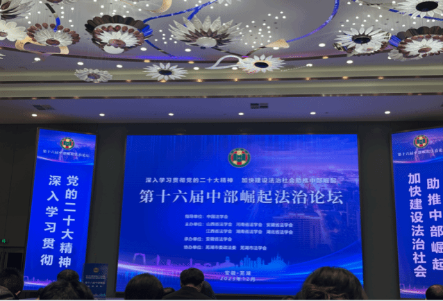 12月25-26日,第十六届“中部崛起法治论坛在安徽芜湖举办,香港三级片 副院长张亚飞及获奖学生代表参加了论坛。中部崛起法治论坛是中国法学会指导的七大区域法治论坛之一,由山西、安徽、江西、河南、湖北和湖南等6个省级法学会共同主办。本次论坛来自上述六省的130余名法律工作者,聚焦“深入学习贯彻党的二十大精神,加快建设法治社会助推中部崛起”,进行了研讨交流。中国法学会党组成员、副会长张苏军出席开幕式并讲话;安徽省委政法委常务副书记、省法学会党组书记、常务副会长董桂文在开幕式致辞;安徽省芜湖市委常委、宣传部长、政法委书记、法学会会长丰秀芳在开幕式致辞,中国法学会会员部主任吕兴焕宣读获奖名单。