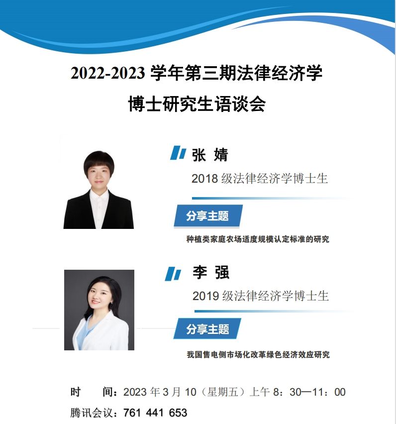 2023年3月10日上午,第三期法律经济学博士研究生语谈会通过腾讯会议线上举行,参加会议的有郗伟明教授、孙淑云教授两位博士生导师以及部分法律经济学博士研究生,会议由2021级博士生张春耕主持。