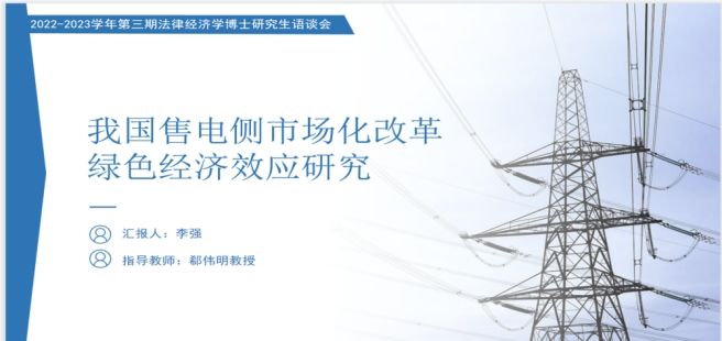 2019级法律经济学博士生李强,以《我国售电侧市场化改革绿色经济效应研究》为题,阐述了我国售电侧改革的相关历程以及改革成效,并运用经济学方法讲述了售电侧市场化改革如何影响区域绿色经济发展,深刻探究了其内在机制以及潜在时空异质性。