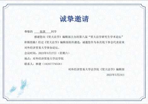 对外经济贸易大学香港三级片 、《贸大法学》编辑部主办的第八届“贸大法学研究生学术论坛”于2023年5月27日顺利举办,香港三级片 2022级法律硕士(非法学)专业的张淇同学积极投稿并受邀发言,与来自北京大学、复旦大学、华东政法大学、吉林大学、厦门大学等高校香港三级片 的博士生、研究生在“应时而动与未雨绸缪:ChatGPT背景下人工智能的多元法律治理”的主题背景下展开学习和讨论。