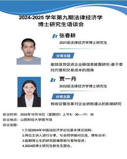 第二部分由法律经济学博士研究生张春耕和贾一丹分别就自己的研究主题进行发言。2021级法律经济学博士研究生张春耕就《能效信贷促进企业碳信息披露研究-基于委托代理和交易成本的视角》进行了主题发言。他从绪论、现状问题、实证剖析、制度完善四个部分对此进行了介绍,研究思路主要是从主要概念界定和相关理论概述及我国碳信息披露法制现状及问题分析着手出发,借助碳信息披露的国内外经验进行丰富扩充,并在文章主体部分从制度影响效率、影响企业行为两个角度进行实证分析,最后提出完善我国碳信息披露制度体系的建议。