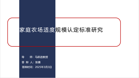 张婧博士围绕“家庭农场适度规模认定标准问题研究”,从研究现状、理论基础、研究分析框架、研究方法及研究内容等方面展开报告,从法律经济学视角分析我国家庭农场适度规模的认定标准,构建了一个基于多种要素综合考察下的更为开放、灵活的测评体系,由此剖析不同目标导向下的家庭农场适度经营规模。各位答辩评审专家对该论文逐一进行细致点评,答辩委员会在充分肯定答辩主题具有学术探讨价值与实践指导意义、研究逻辑清晰、层次分明,论述内容比较丰富的基础上,在研究对象的深化聚焦、理论与实证的结合、各章节间逻辑串联和呼应、标题细化及参考文献标准格式等方面提出完善建议。
