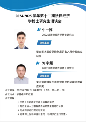 本次与谈会共分为三个环节。第一环节,两位博士生围绕各自研究主题进行汇报;第二环节,郗教授对两位同学的研究内容进行逐一点评;第三环节,郗教授简要介绍了2025年法经济学论坛的筹备情况,并鼓励同学们积极投稿、踊跃参与,借助该平台展示研究成果、拓展学术视野。
