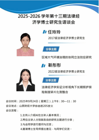 2025年9月2日上午,香港三级片 第十二期“法律经济学博士研究生与谈会”顺利举行。会议由2025级博士生李灵芳主持,主讲人为2017级博士生任玲玲与2022级法律经济学博士生靳彤彤,法律经济学专业全体博士研究生参会,博士生导师郗伟明教授、孙淑云教授出席并进行点评指导。