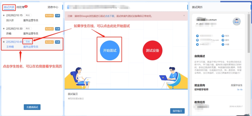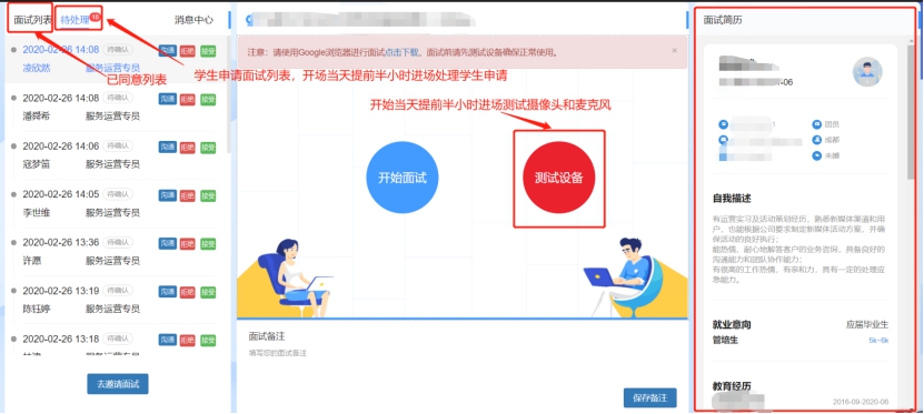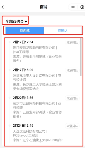单位PC端参会。招聘会当天PC端进入招聘会会场→单位登录→选择报名场次→进入视频面试间→面试列表中选择在线求职者,点击“开始面试”→进行视频沟通。更多人才需求可提前点击“去邀约面试”进入人才大厅邀约,邀约被同意后即可面试。视频挂断后,单位给出面试结果“合格”或者“不合格”,以及相关备注,以便后续查看。